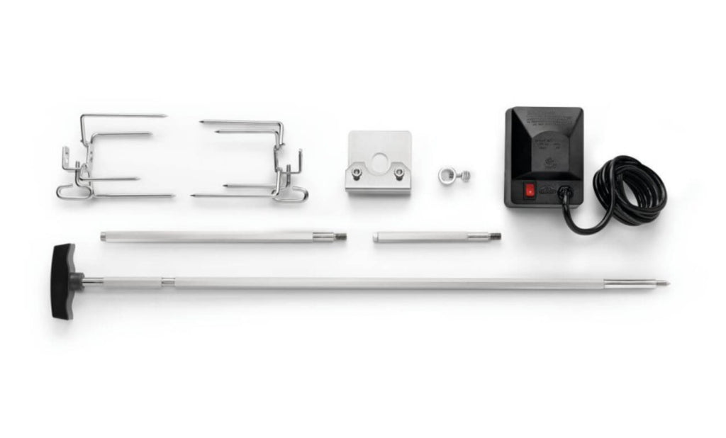 • Everything you need to create delicious rotisserie meals right away, including; heavy duty rotisserie motor, bracket for attaching it to the grill, hexagonal stainless steel spit rod, hexagonal stainless steel spit rod extension, stop bushing, two rotisserie forks, removable end handle, and counterbalance