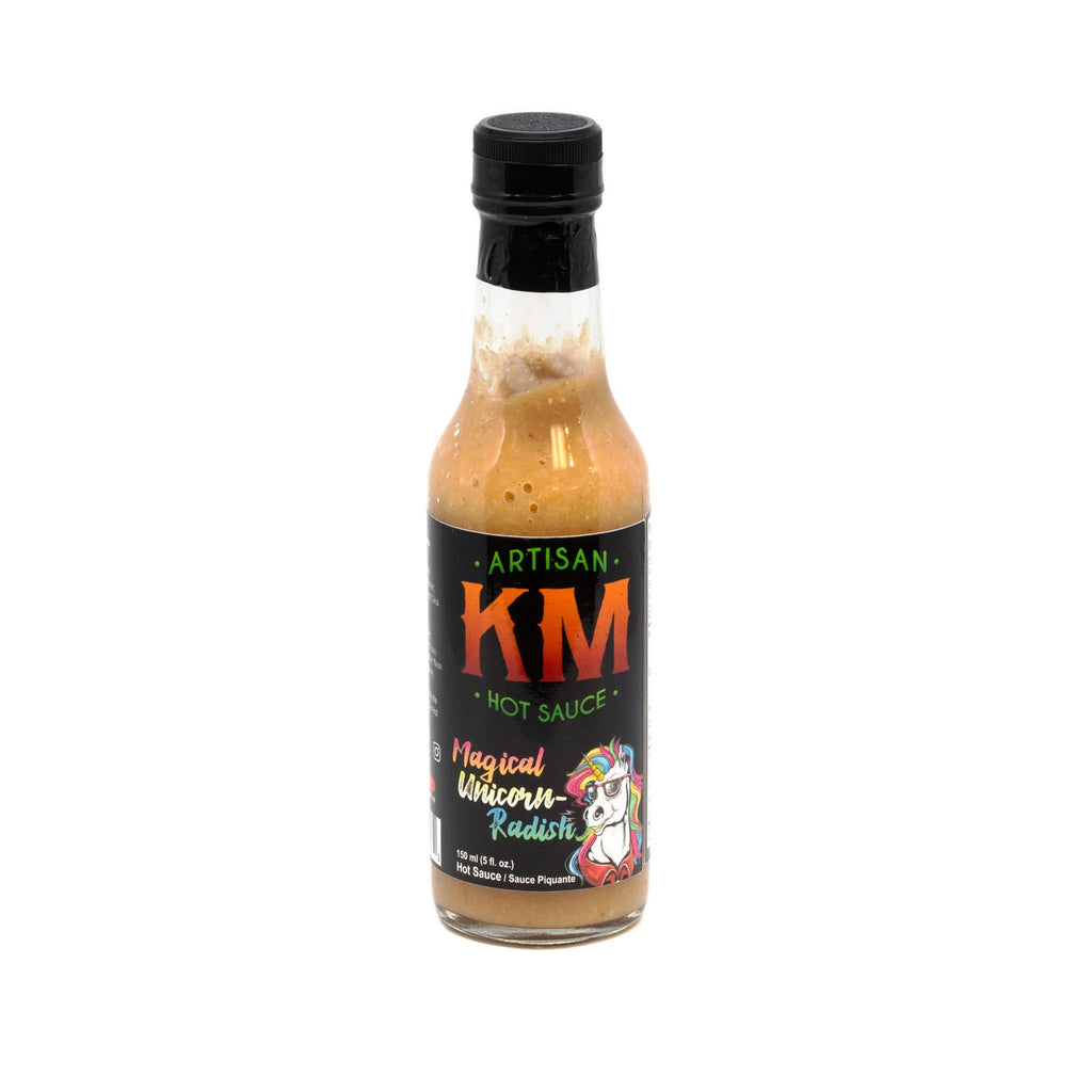 KM ArtisanMade in the Prairies. Magical Unicornradish Hot Sauce is very unique tasting, nice and hot, but very flavourful! Made with fresh horseradish, garlic, habanero peppers and ginger!